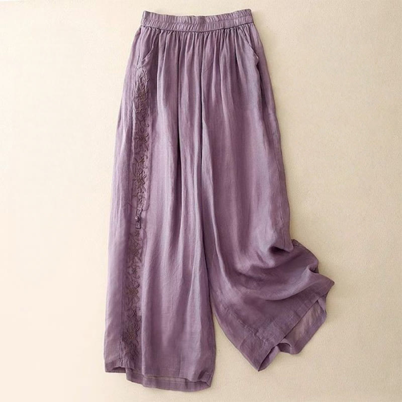 Side Embroidery Design Cotton Women's 7-8 Length Wide Leg Pants With Pockets
