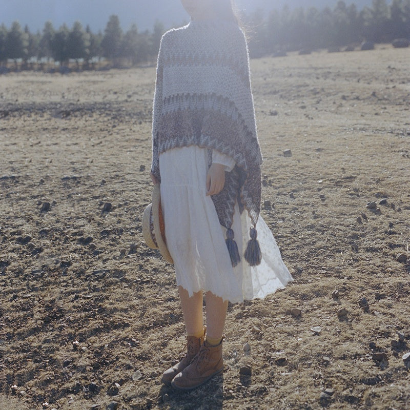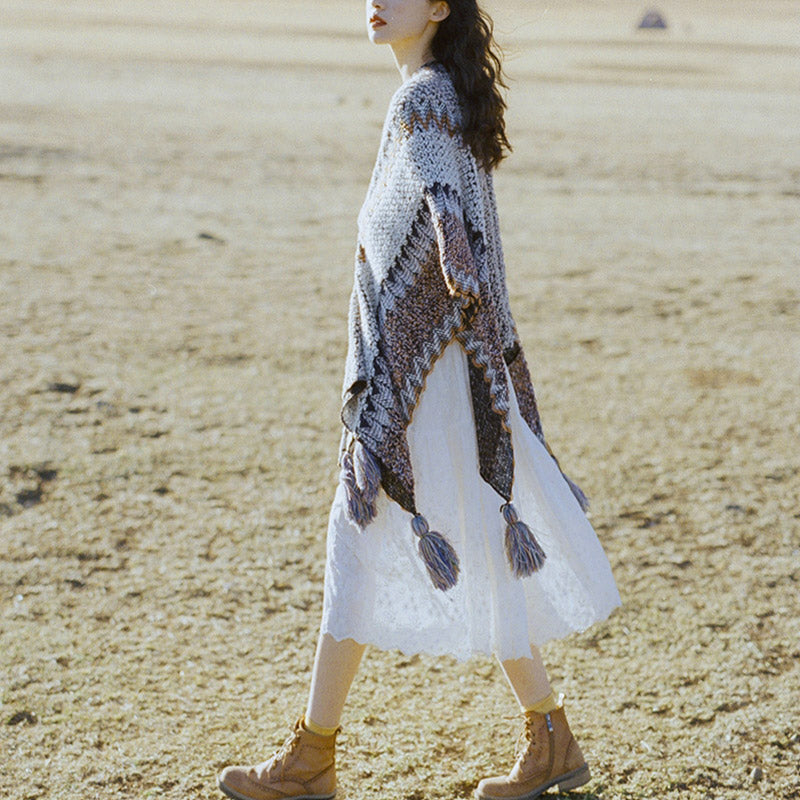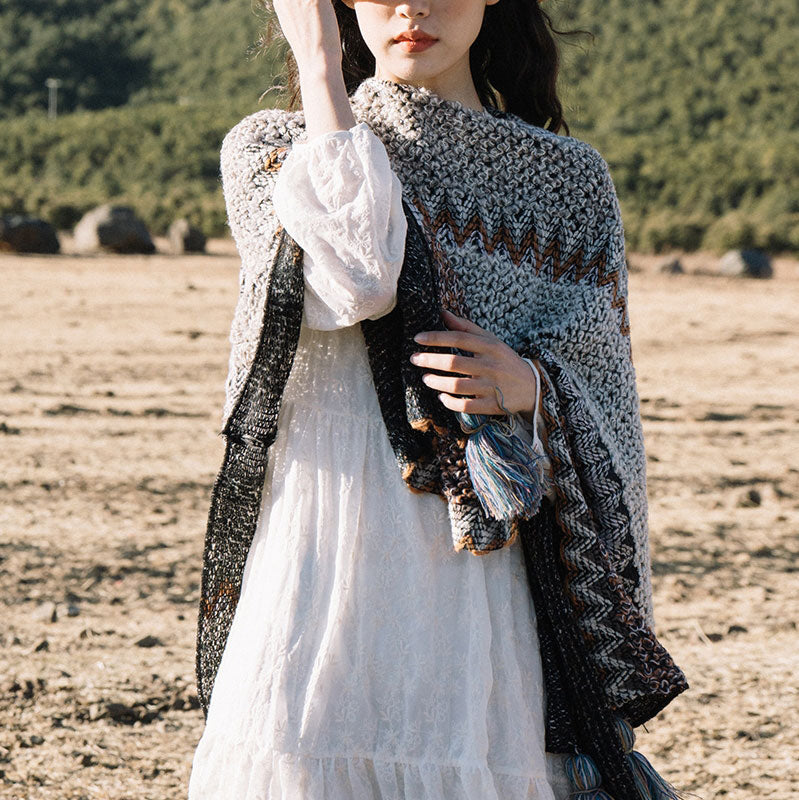 Tibetan Shawl Gray Brown Striped Knitted Tassels Winter Cozy Travel Scarf Wrap