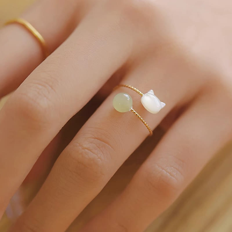 Tridacna Stone Cat Head Jade Bead Blessing Ring