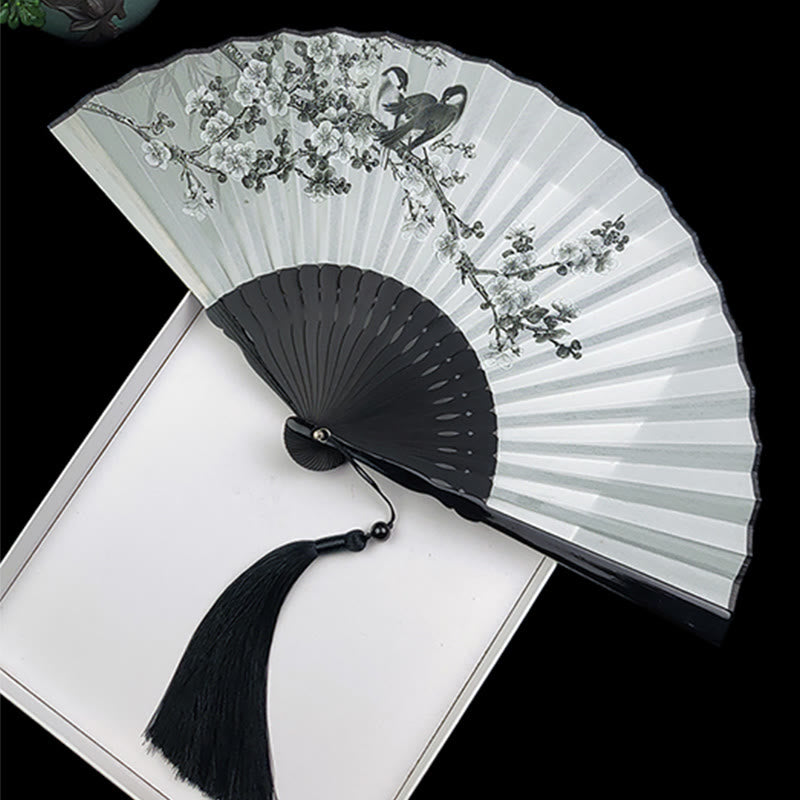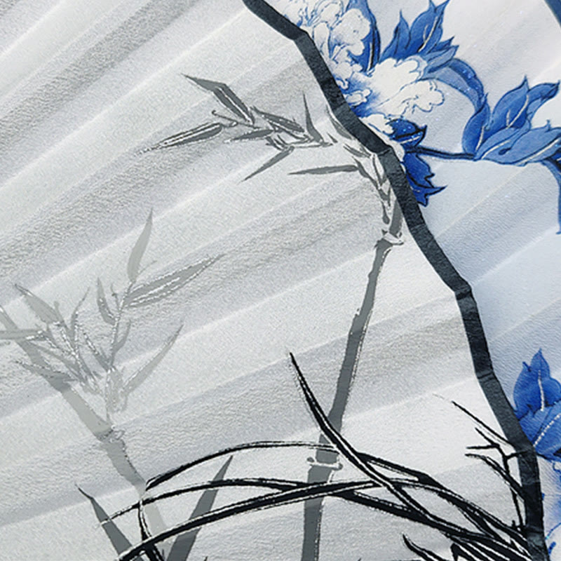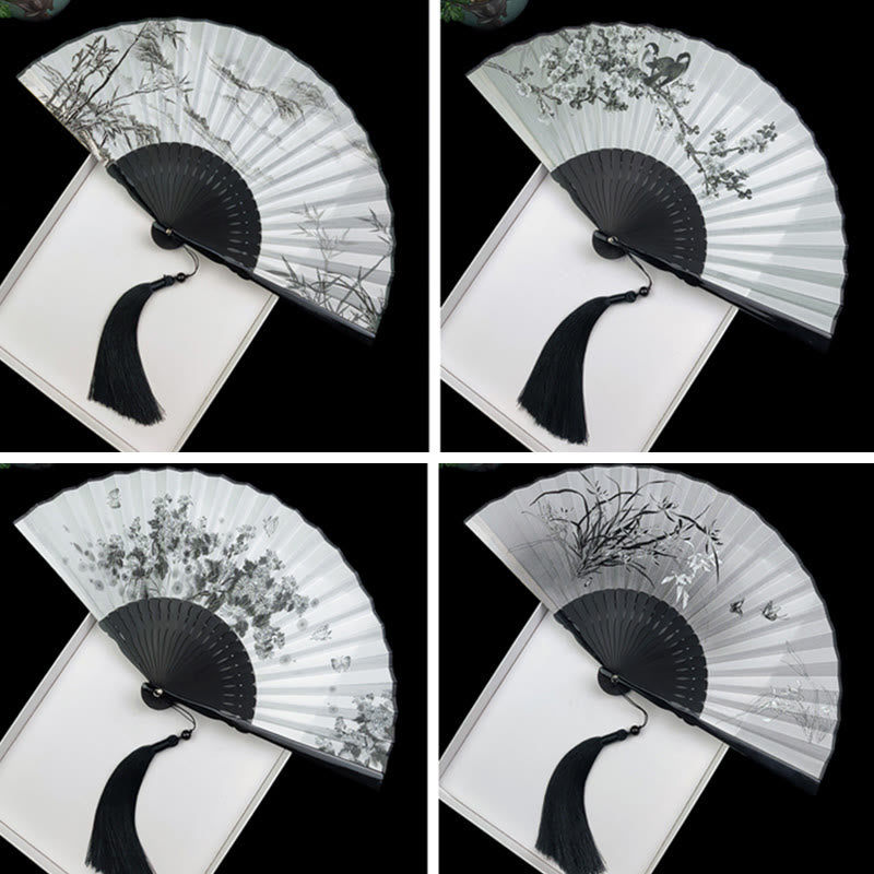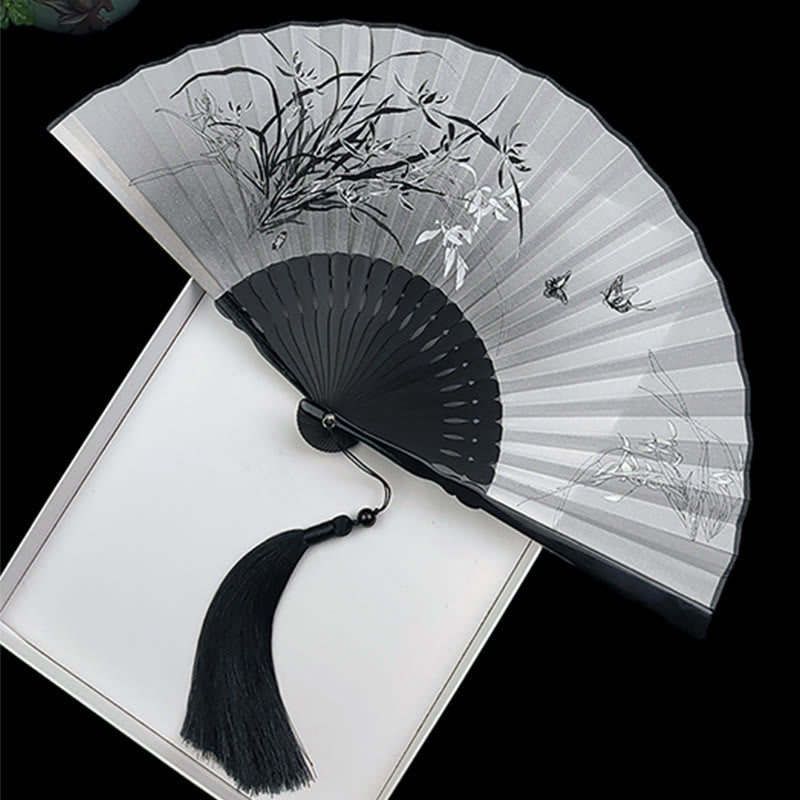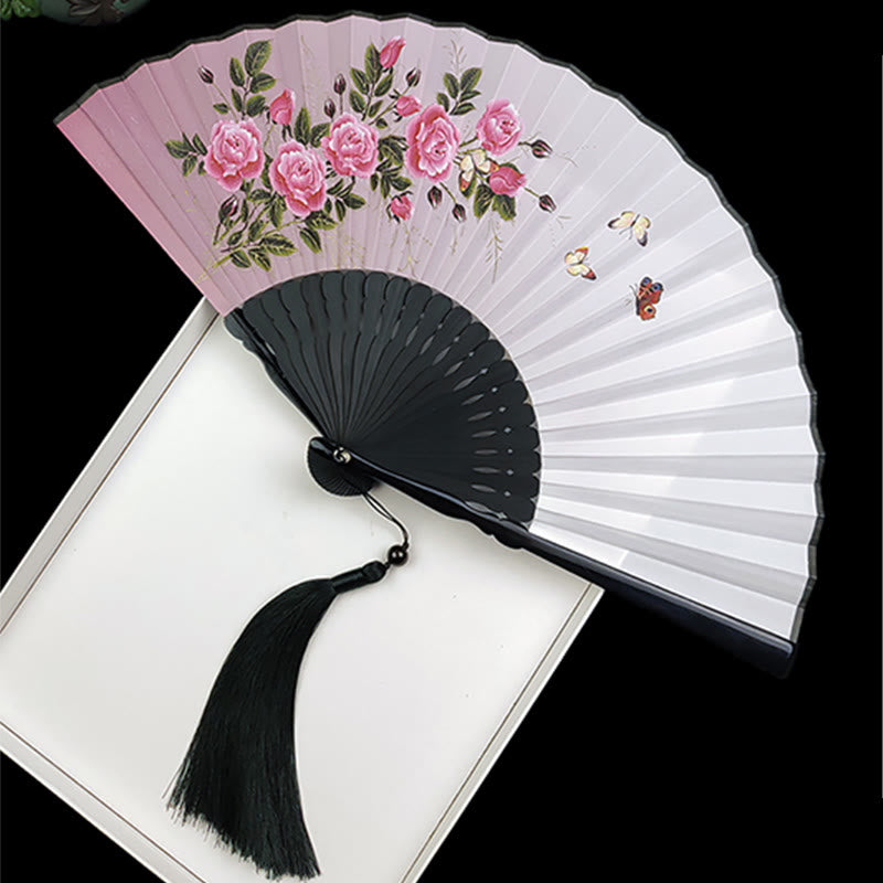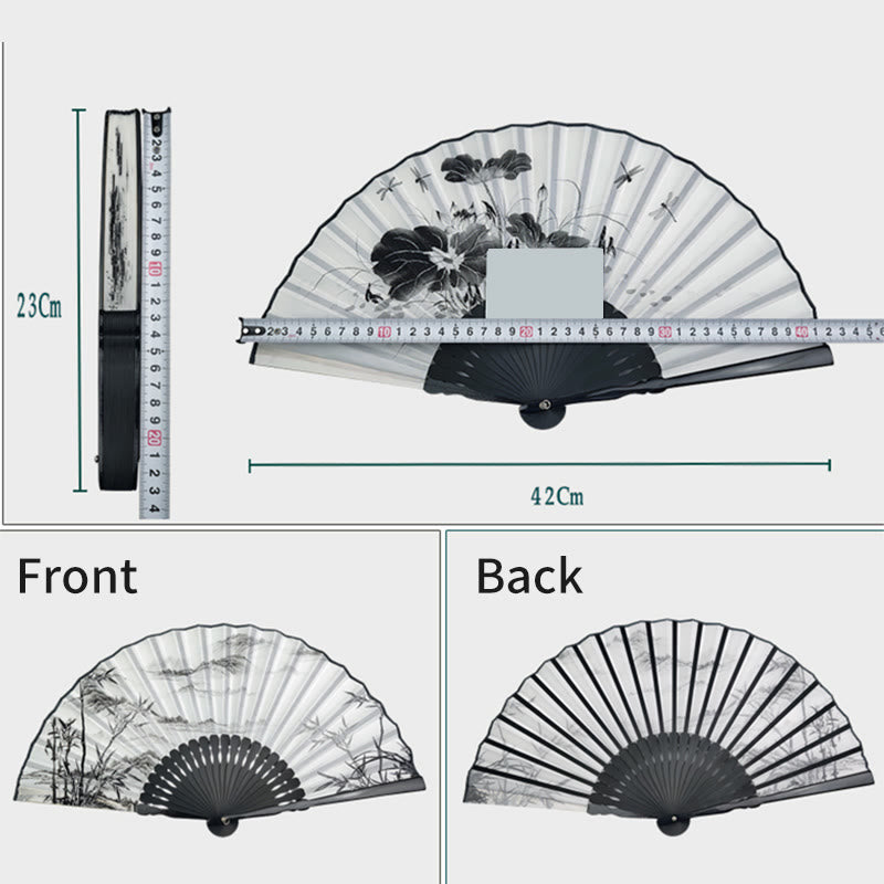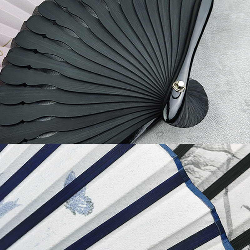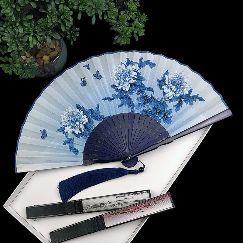 Vintage Bamboo Peony Butterfly Lotus Handheld Silk Folding Fan With Bamboo Frames