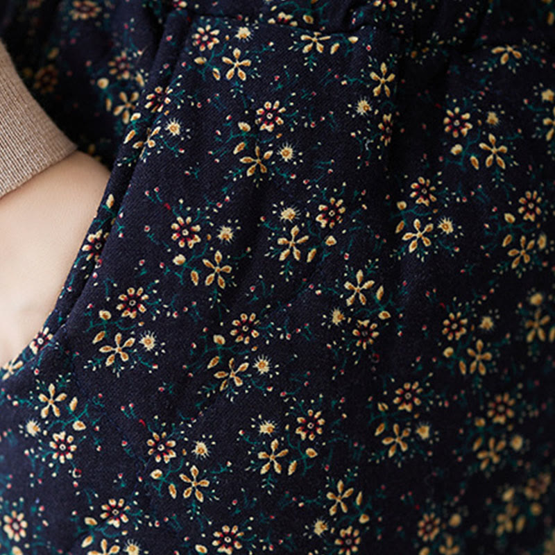 Vintage Floral Pattern Elastic Waist Cotton Women's Midi Skirt With Pockets
